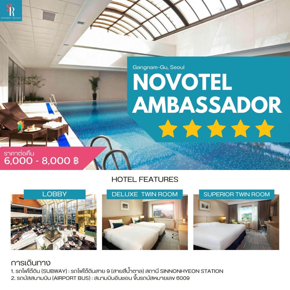 Novotel Ambassador Seoul Gangnam เป็นโรงแรมหรูระดับ 5 ดาวที่ตั้งอยู่ใจกลางย่านกังนัมอันคึกคักของกรุงโซล ทำเลที่ตั้งโดดเด่นทำให้การเดินทางสะดวกสบายอย่างยิ่ง โดยอยู่ใกล้กับสถานีรถไฟใต้ดินและแหล่งช็อปปิ้งยอดนิยมอย่างกาโรซู-กิล การเดินทางไปยังสถานีกังนัมด้วยแท็กซี่ใช้เวลาเพียง 1 นาทีเท่านั้น โรงแรมนี้เพียบพร้อมไปด้วยสิ่งอำนวยความสะดวกระดับพรีเมียม ไม่ว่าจะเป็นสระว่ายน้ำในร่ม ฟิตเนสที่ทันสมัย และห้องอาหารถึง 5 แห่งที่พร้อมเสิร์ฟเมนูหลากหลาย ด้วยบรรยากาศที่หรูหราและการบริการที่ยอดเยี่ยม ทำให้ Novotel Ambassador Seoul Gangnam เป็นตัวเลือกที่สมบูรณ์แบบสำหรับการพักฟื้นหลังการทำศัลยกรรม