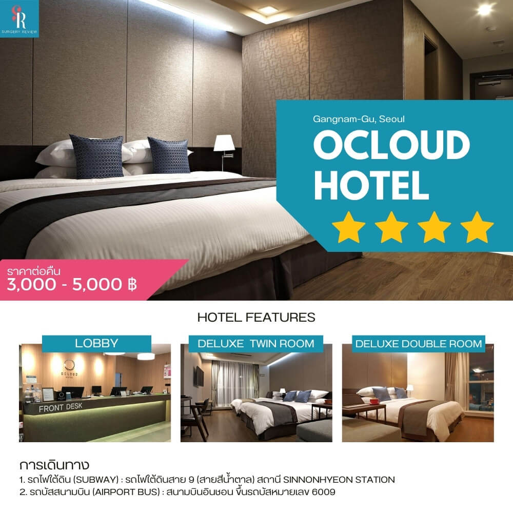Ocloud Hotel Gangnam เป็นโรงแรมขนาดกลางที่โดดเด่นด้วยทำเลที่ตั้ง ซึ่งอยู่ใกล้กับสถานีรถไฟใต้ดิน Gangnam Station มาก ทำให้การเดินทางไปยังคลินิกศัลยกรรมต่าง ๆ ในย่านนี้เป็นไปอย่างสะดวกสบาย เหมาะสำหรับผู้ที่เน้นความสะดวกในการเดินทางเป็นหลัก ห้องพักของที่นี่สะอาดและมีสิ่งอำนวยความสะดวกพื้นฐานครบครันตามมาตรฐานของโรงแรม โดยมีราคาอยู่ในระดับปานกลาง จึงเป็นตัวเลือกที่คุ้มค่าสำหรับคนที่ต้องการพักฟื้นในบรรยากาศที่เรียบง่ายแต่ยังคงไว้ซึ่งความสะดวกสบาย
